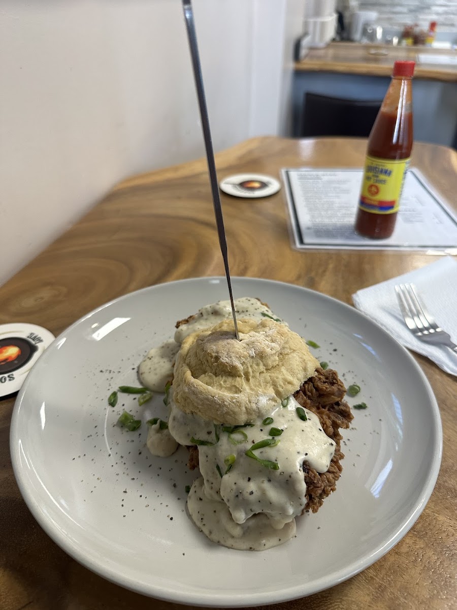 Oh my biscuits! Sit in the front seat and you get a Southern Omakase style? Owner/Chef hustling while you get front row seat to his southern cooking! Feels like he's cooking for you in his own home. Service: --Decent. He greeted us when we walked in. He was crazy busy since it was peak brunch time. Service was slow to start, we seated and waited till someone took our order. Somehow he still manages to deliver good food without cutting corners. Some indoor and outdoor seating. I'd call in your order if you're in a rush since it took some time to get our food. Ambiance: Overall nicely decorated spot that gives homey vibes. Counter seating in the front, a few tables inside and outdoor seating. Warning: it's HOT! No ac, so it was quite warm. I'd bring a fan or try to sit outside maybe next time. Pretty uncomfortable to sit inside near the counter area. Was sweating a lot. Food/Drinks: --Chicken Biscuits & Gravy ($17) Juicy boneless fried chicken nestled between 2 soft crispy biscuits, smothered with house made gravy and topped with green onions for that extra flavor. I savored each bite wanting more and more. Modest portion. --Coffee ($2.5) Very affordable and good cup of joe to enjoy your brunch. He uses Cafe du Monde which was good. Comes out piping hot though. Value: Dishes are sized more modest for the price, so I was satisfied with the meal without feeling too full. Might be too little for a hungry person though. Southern take, but definitely not like the portions you get in the south. Parking: The parking and location is probably the biggest con of this place, as there are only a few stalls in the front. We had to circle around and pay for metered street parking. We paid for 1 hour parking and we came during the brunch rush so it was the perfect amount of time to dine in. We will be back again!